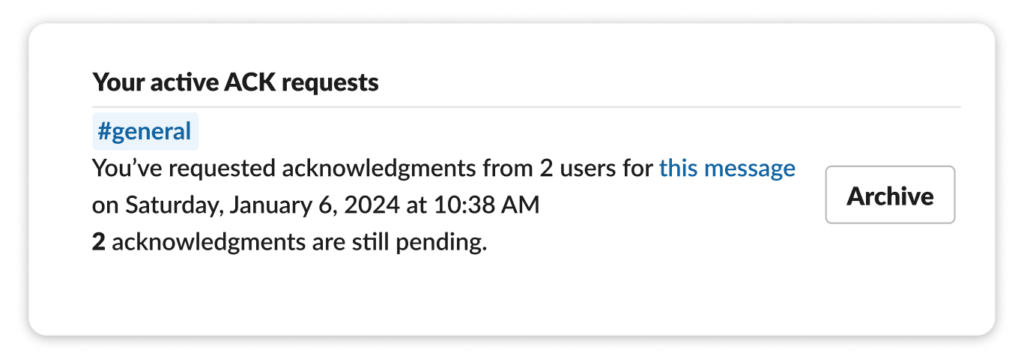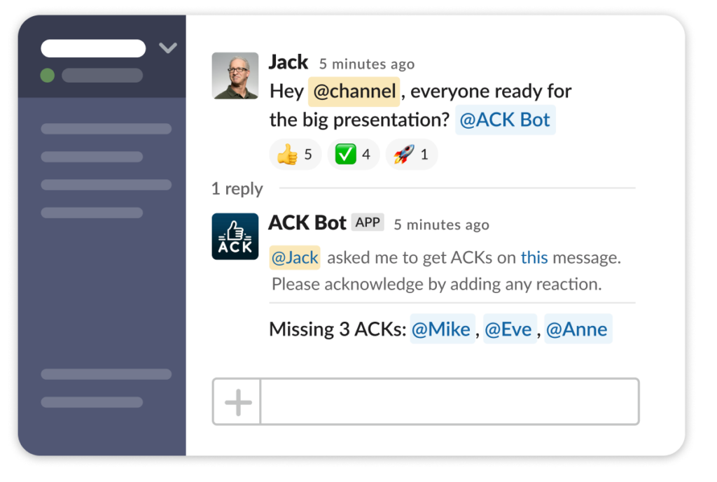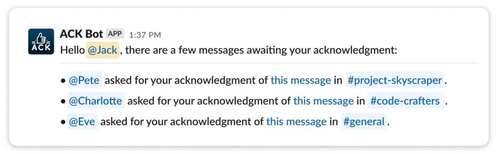 Once you’ve asked for acknowledgment, ACK Bot becomes your trusty sidekick, keeping you in the loop on who’s yet to react to the message.